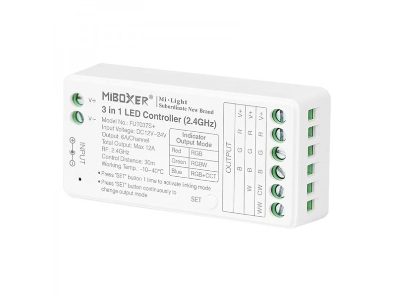 Primeren je za upravljanje različnih tipov LED trakov: RGB, RGB+W in RGB+CCT. Način delovanja je možno izbirati s pritiskom na tipko na sprejemniku.