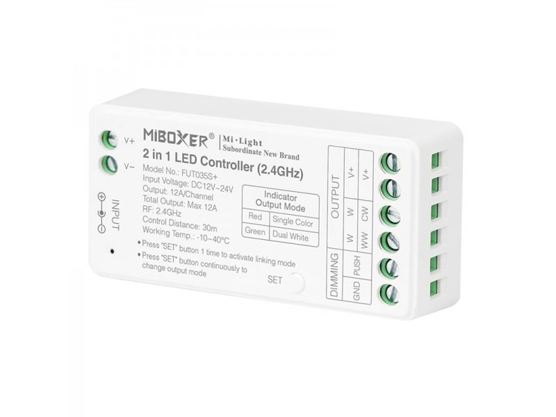 Primeren je za upravljanje različnih tipov LED trakov: enobarvni ali CCT. Način delovanja je možno izbirati s pritiskom na tipko na sprejemniku.