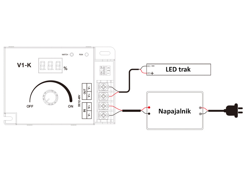 Tudi, če se napetost na zatemnilniku popolnoma izklopi: ko LED trak prižigamo in ugašamo s stikalom/daljinskim sistemom vezanim pred napajalnik, zatemnilnik še vedno opravlja svojo funkcijo in LED trak vedno zatemni na isto stopnjo. V tem primeru zatemnilnik zvežemo med izhodom napajalnika in LED trakom.